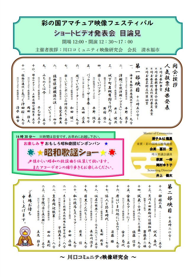 【企画】 ※表彰式:ショートビデオ人気投票発表 ※第1部:ショートビデオ11作品の発表 ※昭和歌謡ショー:おもしろ昭和劇団ピンポンパン ※第2部:ショートビデオ12作品の発表