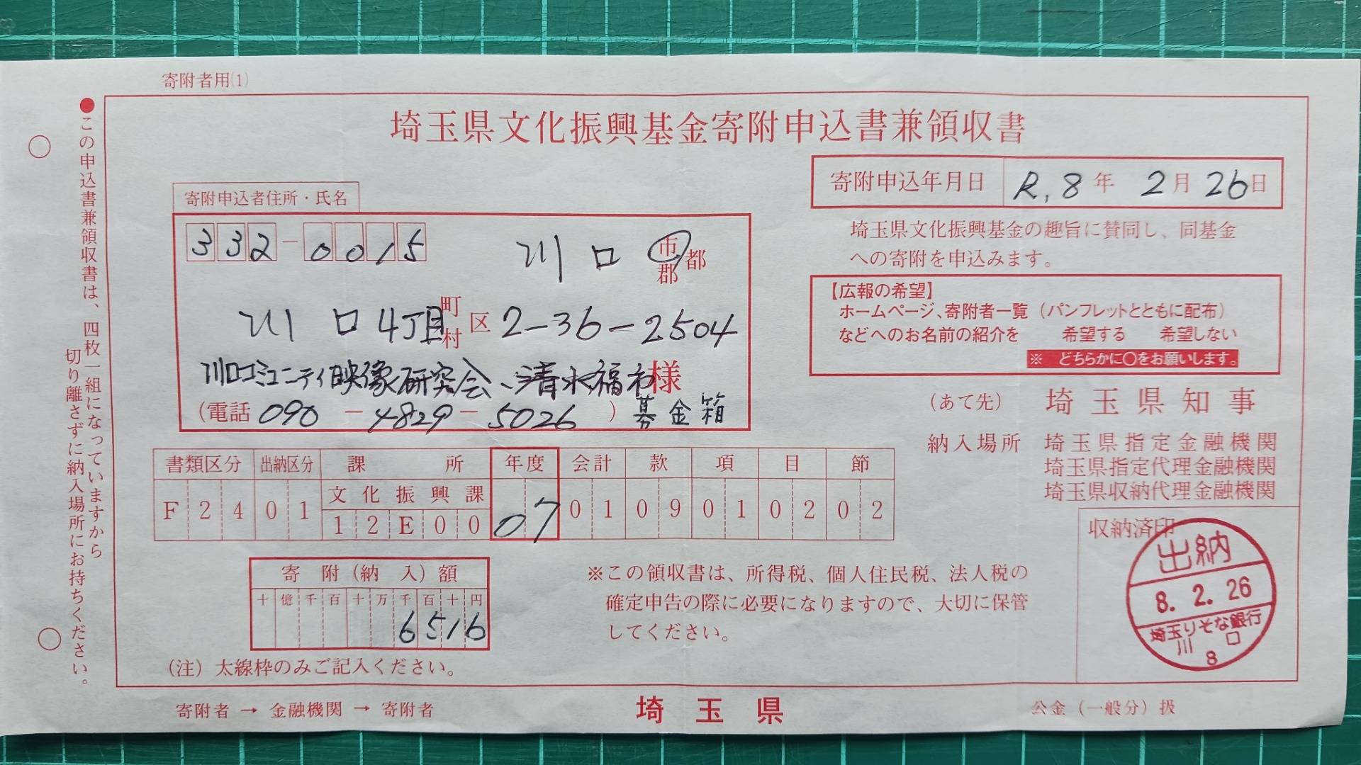 真心に感謝! 埼玉県文化振興基金への募金 ありがとうございました 埼玉りそな銀行川口支店から6,516円の募金を寄付指せて頂きました