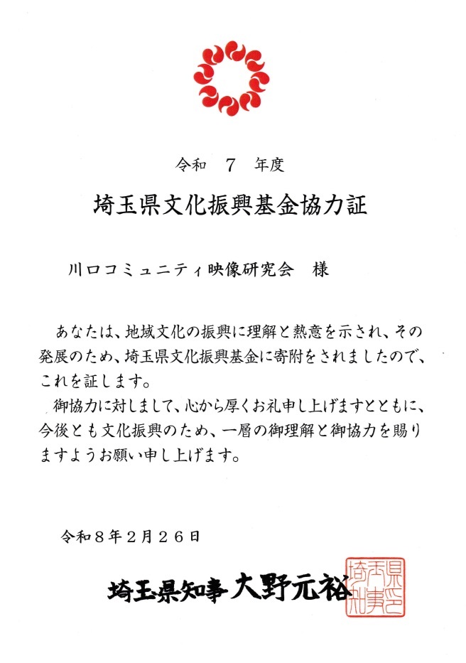 【 主 催 】・川口コミュニティ映像研究会 【共催団体】・シネ・ビデオサークル熊谷・春日部シネサークル 越谷ビデオクラブ・映像クラブ秩父・さいたまビデオサークル 映像クラブ秩父・川口映像ボランティアの会 【協賛/支援】・埼玉県芸術文化祭2025・埼玉県文化振興基金事業【後援団体】・川口市・彩の国埼玉映像連盟 東上映像アカデミー・川口 ロータリークラブ 川口情報センターマイシティじゃ~なる・㈱仲川工務店